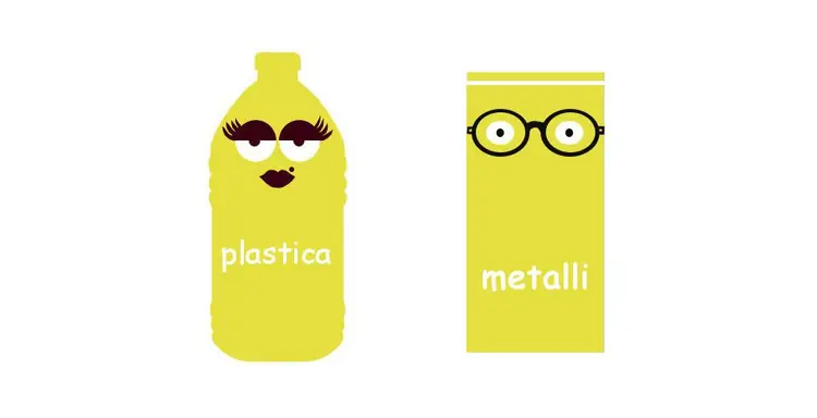 COSA DIFFERENZIARE: Bottiglie, contenitori per detergenti e detersivi risciacquati, contenitori per uova, sacchetti, buste per alimenti, vasetti dello yogurt, vaschette e gusci in polistirolo, piatti e bicchieri di plastica puliti o comunque privi di evidenti residui, reti per frutta e verdura. Lattine in alluminio, scatolette e barattoli in metallo per alimenti, tappi e coperchi metallici, fogli e vaschette in alluminio, piccoli oggetti metallici (viti e chiodi, graffette, posate, ecc.), grucce appendiabiti in plastica e metallo.